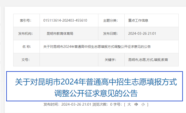 昆明信息港讯 3月26日,昆明市教育体育局发布《关于对昆明市2024年普通高中招生志愿填报方式调整公开征求意见的公告》,2024年昆明市普通高中招生拟采取见分填报志愿方式,即成绩公布后填报志愿和录取过程中征集志愿,其他不变。现面向社会公开征求意见。