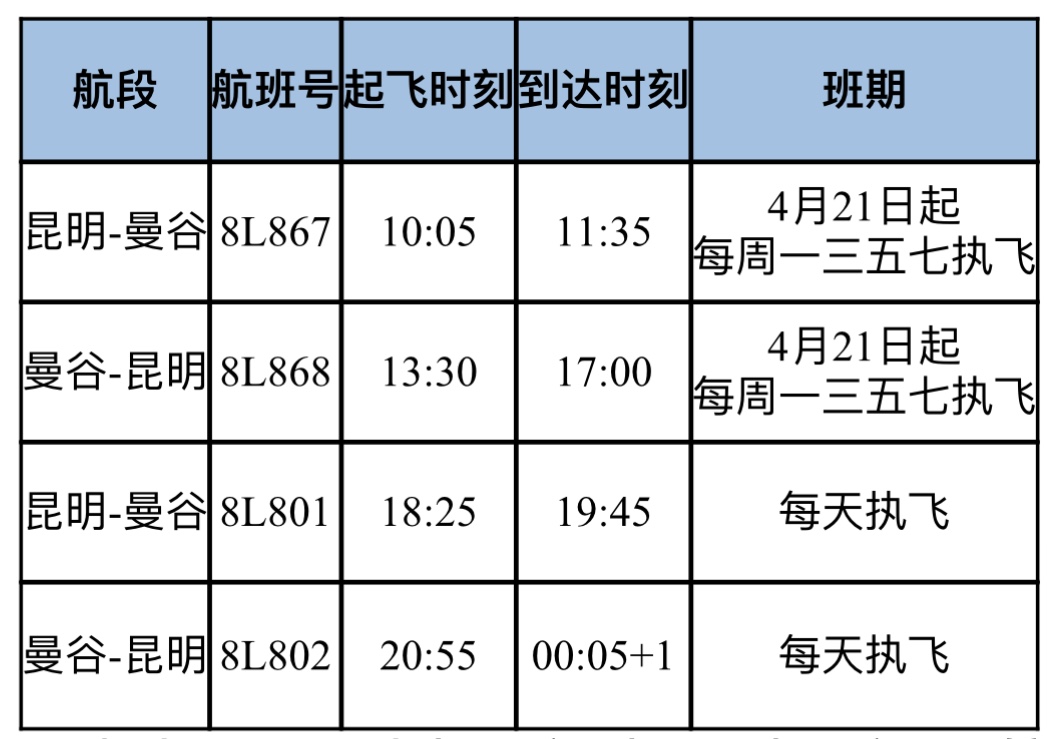 昆明信息港讯 记者上官艳君 3月27日,记者从云南祥鹏航空有限责任公司(下称“祥鹏航空”)获悉,为更好满足中泰两国旅客的出行需求,祥鹏航空将于4月21日起加密昆明往返曼谷航班,届时每周共将执飞11班。