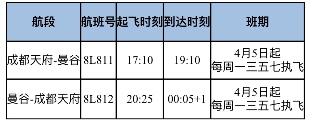 另悉,祥鹏航空还将于4月5日起正式复航成都天府往返曼谷航班,每周一、三、五、七执飞。