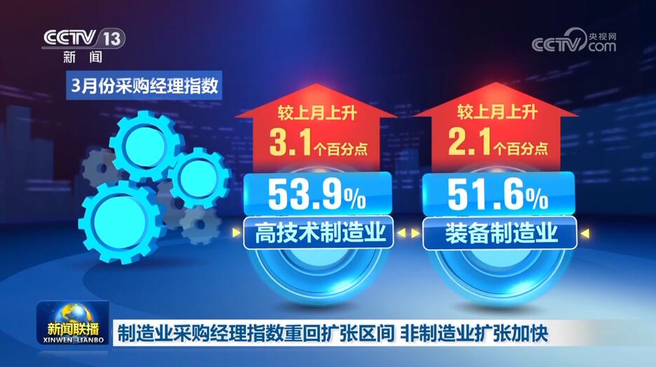 中国物流与采购联合会、国家统计局服务业调查中心今天(3月31日)公布3月份中国采购经理指数。制造业采购经理指数重回扩张区间,景气水平明显提升,非制造业继续加快扩张。