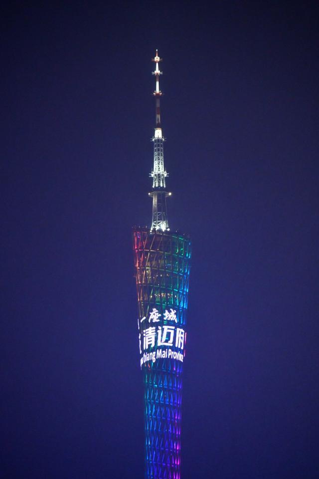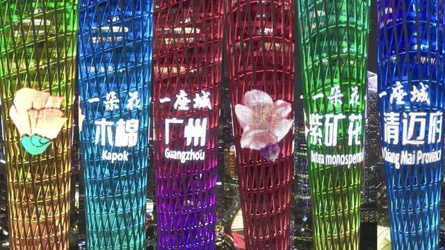 3月29日晚,随着“一朵花一座城”和“广州木棉”“清迈府紫矿花”等字幕和花卉图案在广州塔身徐徐滚动,广州塔亮灯也成为两市友谊见证。