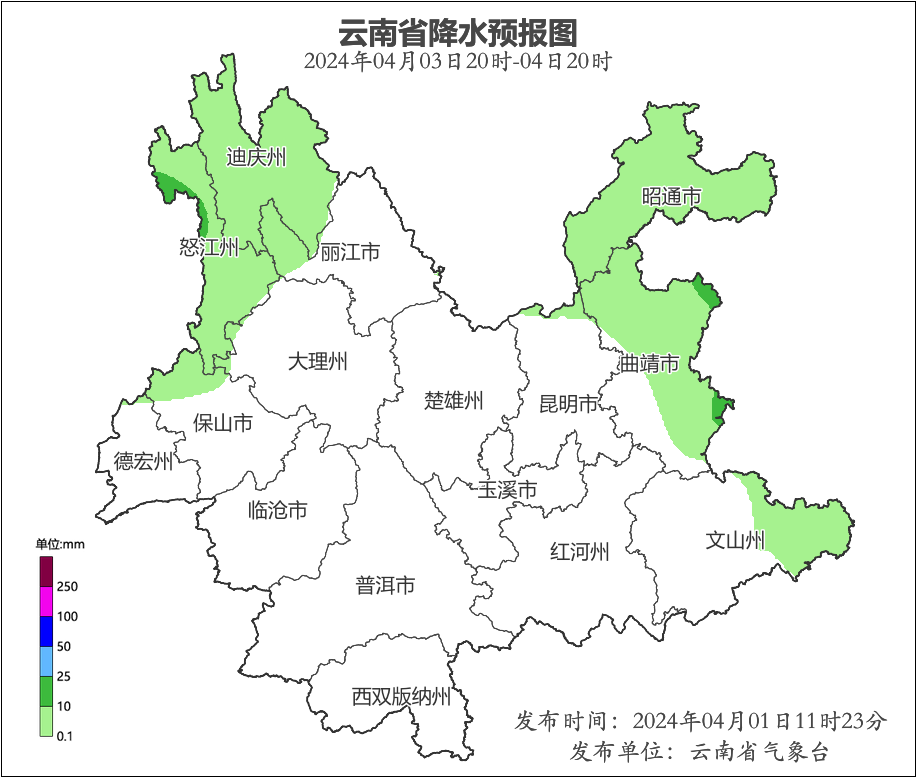 4月3日20时到4月4日20时:昭通市、曲靖市、文山州东部、迪庆州、怒江州、保山市北部多云有阵雨局部中雨,其他地区晴间多云。