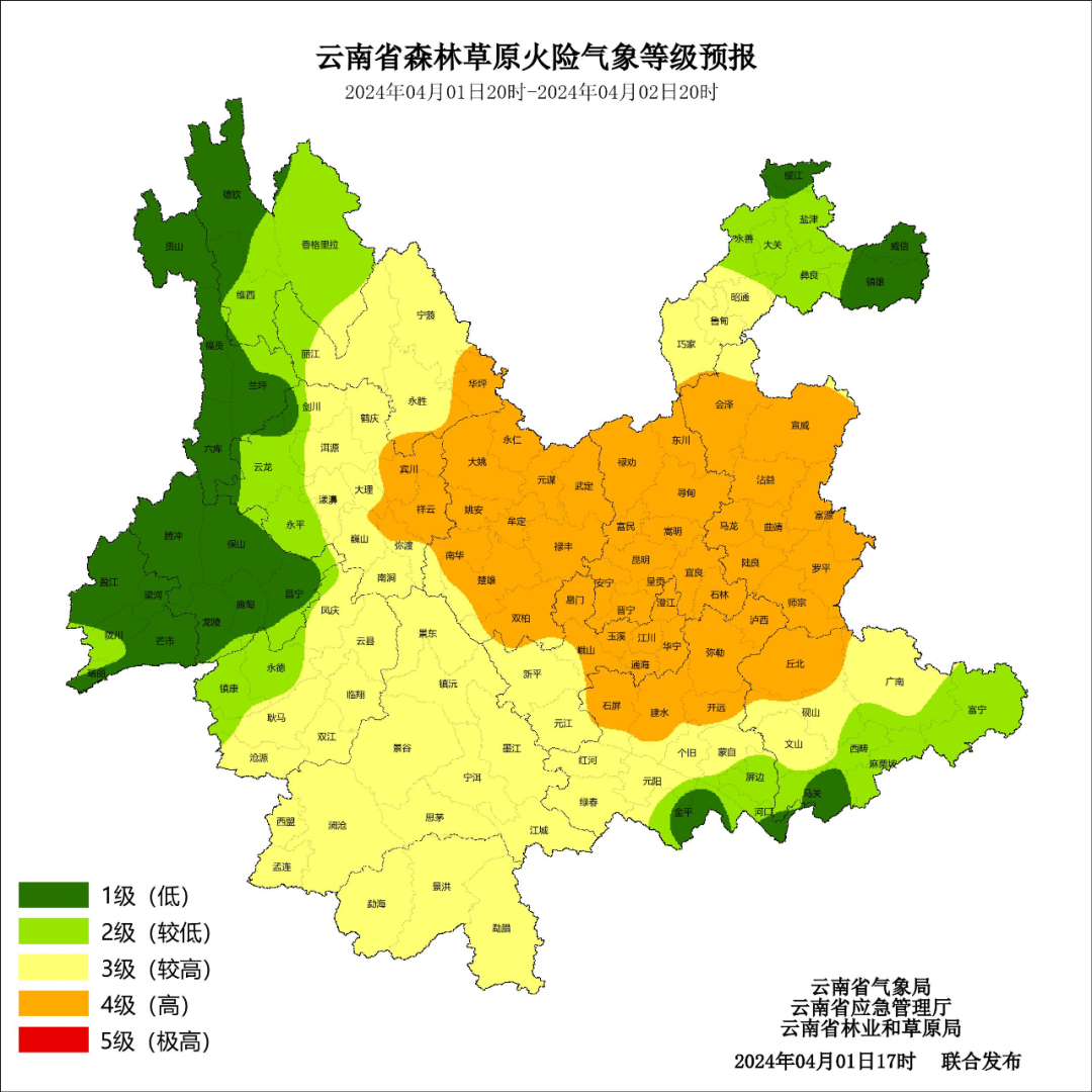 预计,丽江市东南部、大理州东部、楚雄州、昆明市、玉溪市东部、红河州北部、曲靖市、文山州北部4级,丽江市中部、大理州西部和中部、临沧市东部、普洱市、西双版纳州、玉溪市西部、红河州中部、文山州中部、昭通市南部3级,其他地区1~2级。