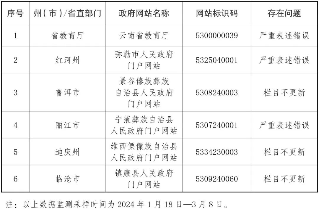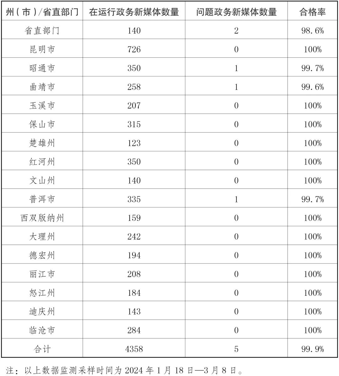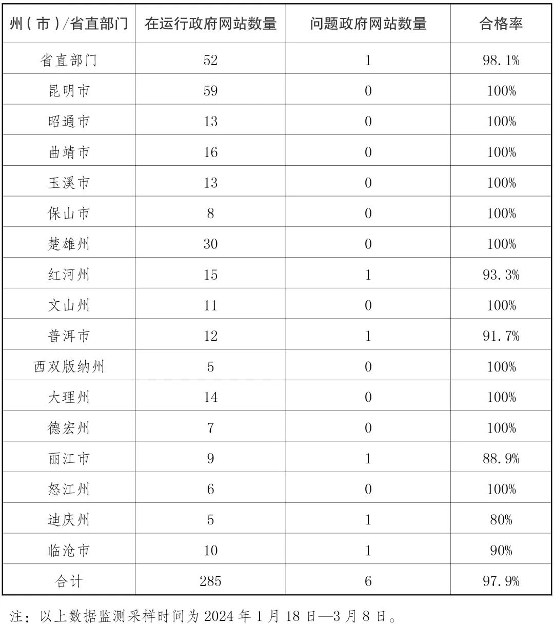 记者从“云南省人民政府门户网站”公布的《云南省人民政府办公厅关于2024年一季度 全省政府网站和政府系统政务新媒体检查情况的通报》上获悉,2024年1月18日—3月8日,全省在“全国政府网站信息报送系统”中登记的在运行政府网站285个,检查发现6个不合格,总体合格率为97.9%。以下为通知全文: