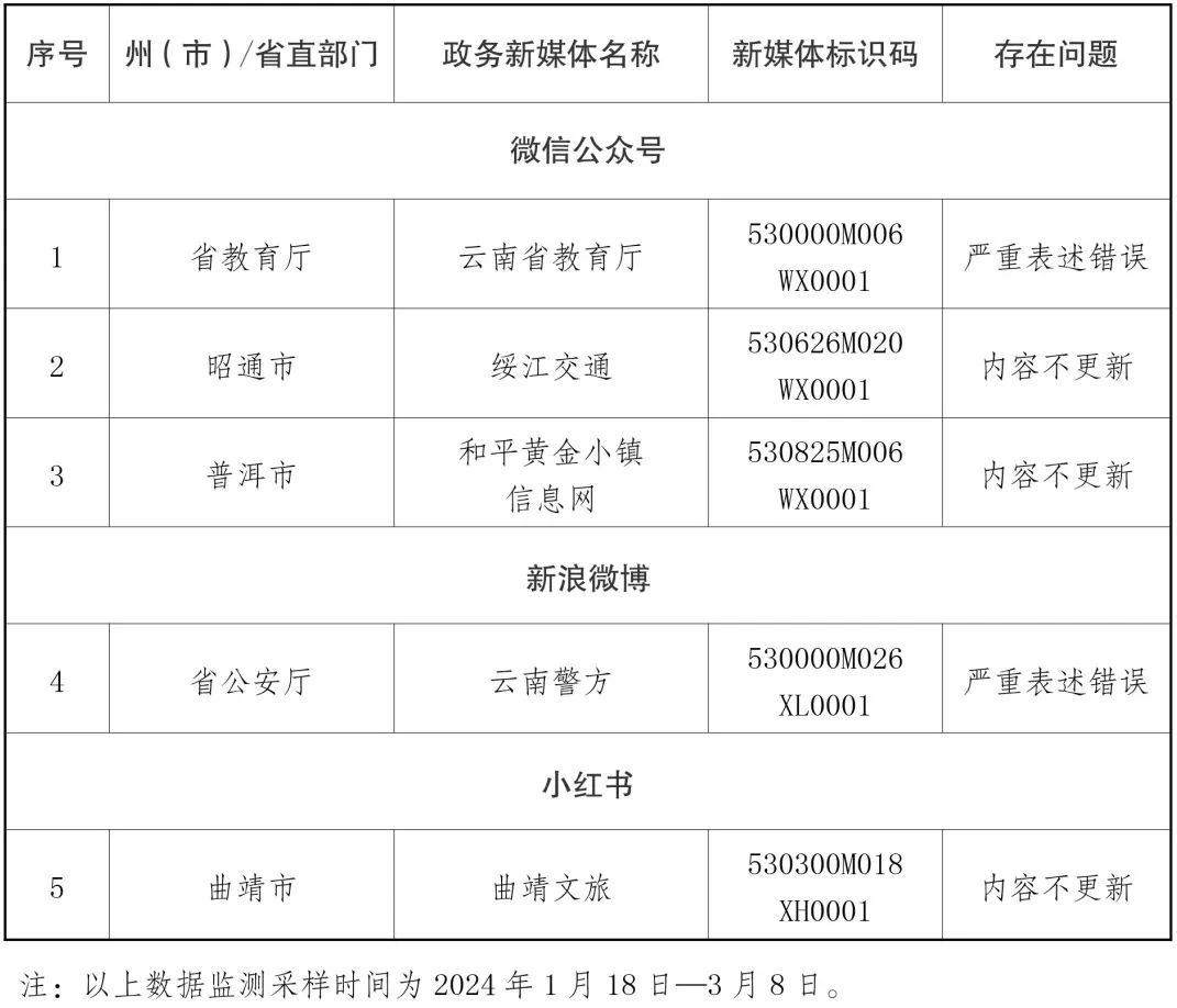 (一)运维保障方面。一是个别单位对发布信息审核把关不严格,多字、漏字、错字等问题仍然存在,如省教育厅“云南省教育厅”网站和“云南省教育厅”微信公众号。二是个别地区对政府网站和政府系统政务新媒体常态化监管不到位,如迪庆州“维西傈僳族自治县人民政府门户网站”存在多个空白栏目,曲靖市“曲靖文旅”小红书APP内容长期不更新,楚雄州“永仁法治在线”、普洱市“宁洱医疗保障”微信公众号个别栏目长期处于“建设、维护”状态。三是个别政府部门政务新媒体存在信息报送系统填报错误、账号信息变更、账号开设与注销未及时进行备案等情况,如丽江市“丽江人防”微信公众号。