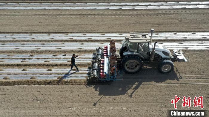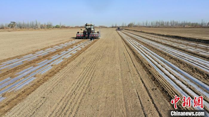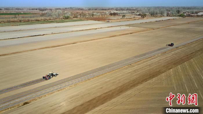 在沙雅县海楼镇博孜墩村的一处高标准农田里,两台大马力拖拉机牵引的播种机正来回穿梭,借助北斗导航系统,实现了无人驾驶进行棉花播种作业,可一次性完成铺膜、铺滴灌带、播种、覆土等作业,且播行端直、耕作精准,作业率高,也方便棉花成熟后机械化采收。