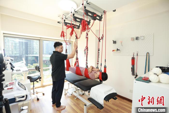 郭耀鸿的“小天地”位于朝阳区CBD,近120平方米的面积尽管不大,配套却丰富。哑铃凳、瑜伽球、“红绳”悬吊器械等各类设备整齐摆放,书架上陈列着各式康复书籍。近日,郭耀鸿在他开办的康复中心接受中新社记者采访,分享来大陆发展的故事。