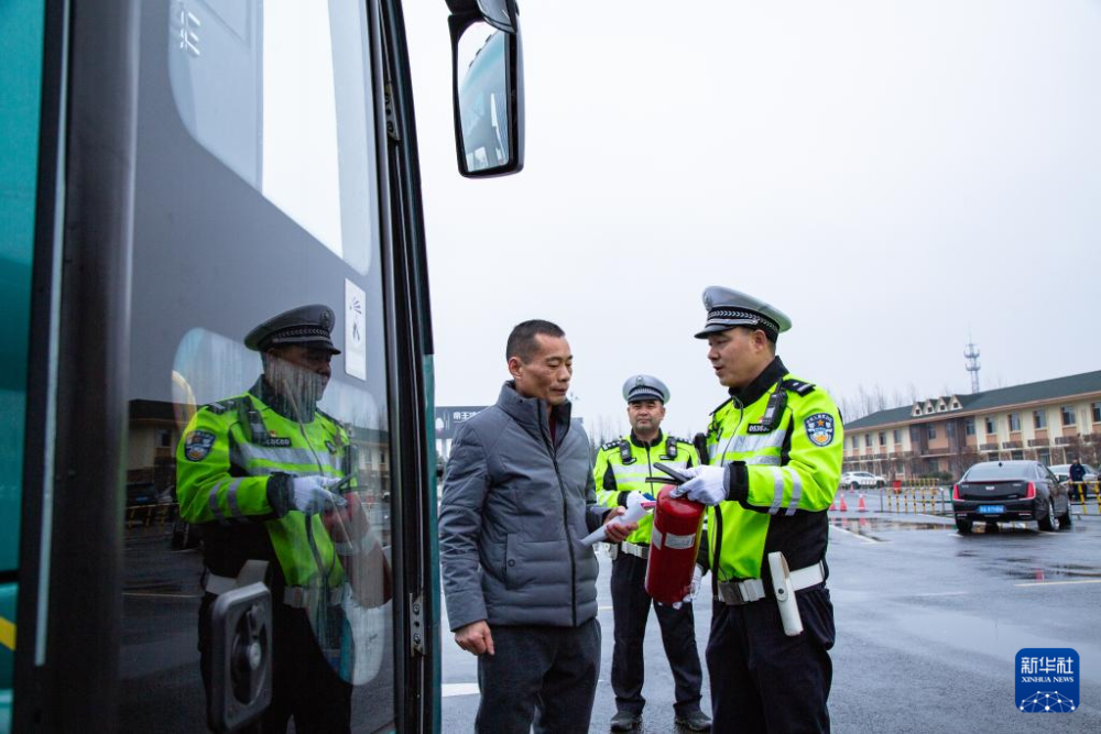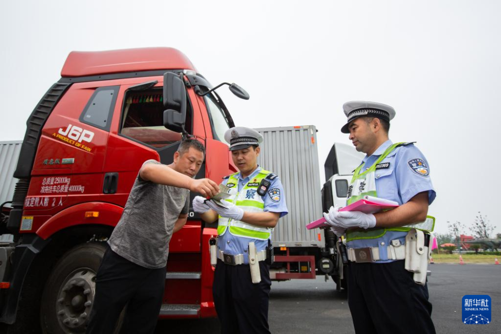 江苏省常州市公安局交警支队高速公路一大队一级警长李忠(右二)生前的工作照(资料照片)。新华社发