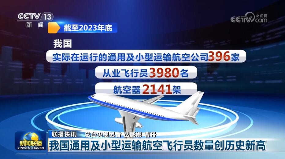 记者从中国民航局了解到,截至2023年底,我国实际在运行的通用及小型运输航空公司396家、航空器2141架、从业飞行员3980名,人数创历史新高,较上年增长18.1%。