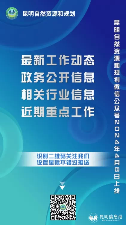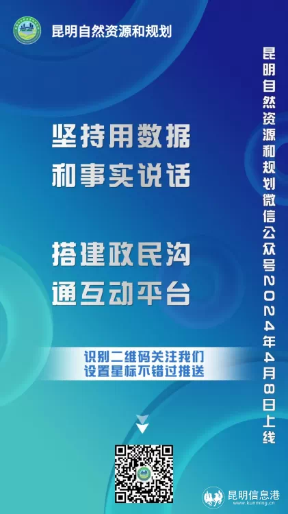2024年4月8日,昆明市自然资源和规划局官方微信公众号“昆明自然资源和规划”正式上线运行。