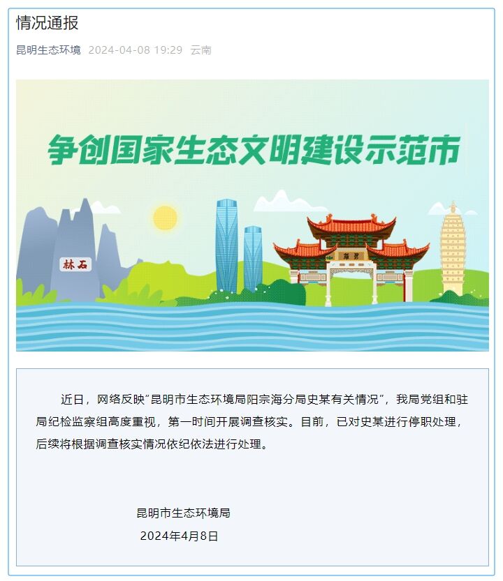 近日,网络反映“昆明市生态环境局阳宗海分局史某有关情况”,我局党组和驻局纪检监察组高度重视,第一时间开展调查核实。目前,已对史某进行停职处理,后续将根据调查核实情况依纪依法进行处理。