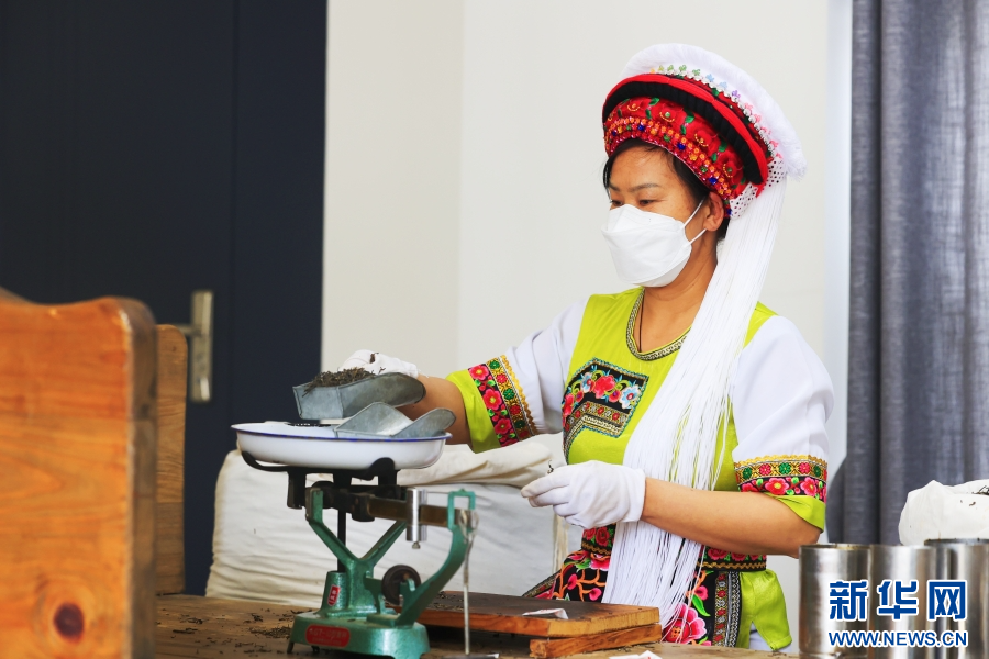 下关沱茶馆传统制茶工艺展示区,工作人员正在称茶(摄于4月1日)。新华网 赵普凡/摄