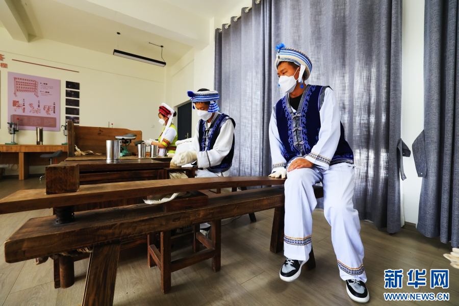 下关沱茶馆,工作人员展示传统制茶工艺(摄于4月1日)。新华网 赵普凡/摄
