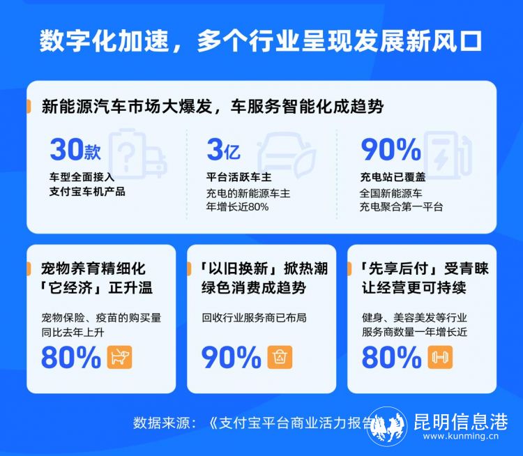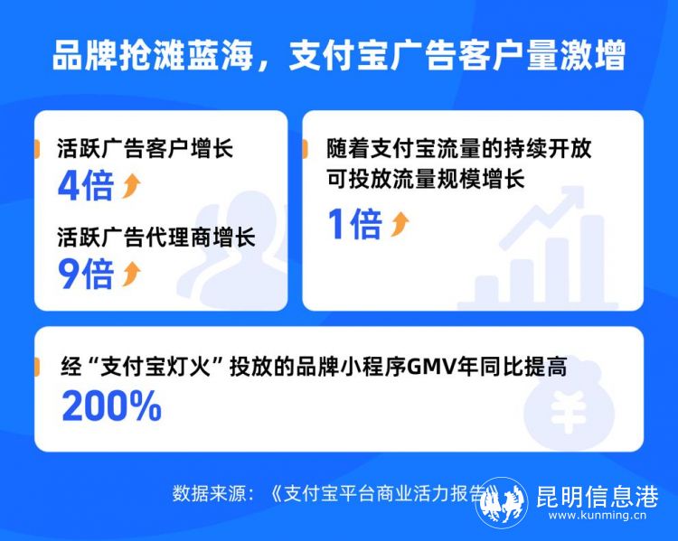 4月11日,支付宝发布首份平台商业活力报告,数据显示:过去一年,随着平台持续开放和互联网业务发展,流量商业化增速显著,活跃广告主数量涨了 4 倍;内容化布局为泛财商领域创作者带去新增量,直播间数增长14倍。目前,支付宝App已成车主、学生等各大垂类人群聚集地,呈现高净值、年轻化、细分化三大特征;同时,新能源、大健康、宠物养育、绿色回收等行业增速显著。