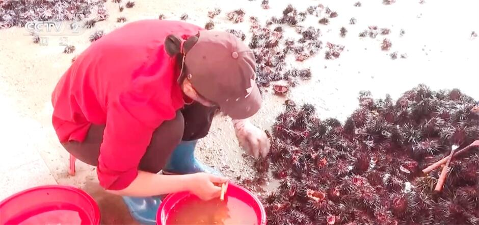 在海胆加工厂里,工人们熟练地撬开海胆壳,挖出海胆肉,用镊子将杂质去除,再用清水清洗干净,一份色泽金黄、品质新鲜的海胆肉就呈现在眼前了。