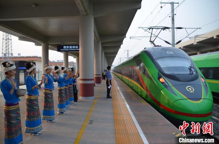 4月13日,首列中老铁路西双版纳至琅勃拉邦国际旅客列车驶出西双版纳站。中新社记者 缪超 摄