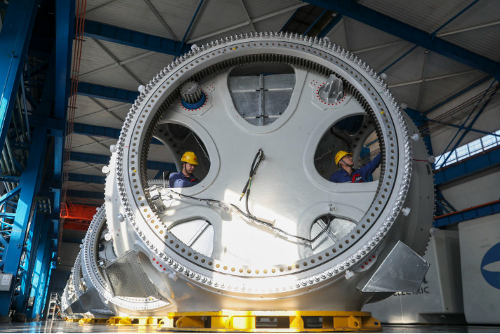 2024年3月5日,在位于黑龙江省齐齐哈尔市的中国一重集团有限公司风电装备生产制造厂生产车间,工作人员在组装设备。新华社记者 张涛 摄