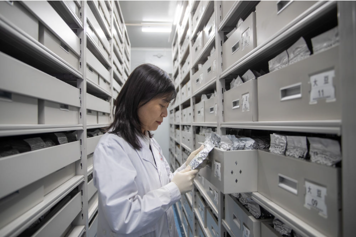 2024年4月2日,工作人员在国家寒带作物及大豆种质资源中期库(哈尔滨)内查看大豆种质情况。新华社记者 张涛 摄