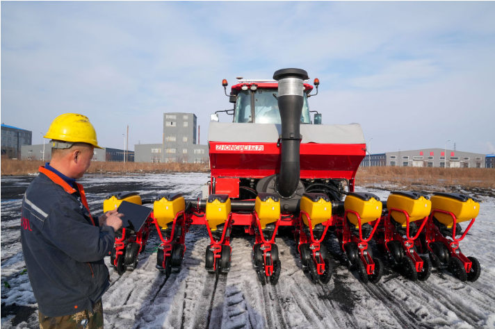 2024年3月13日,在黑龙江省众为农机有限公司,工作人员在测试一款高速气吹电驱播种机的控制系统。新华社记者 王建威 摄