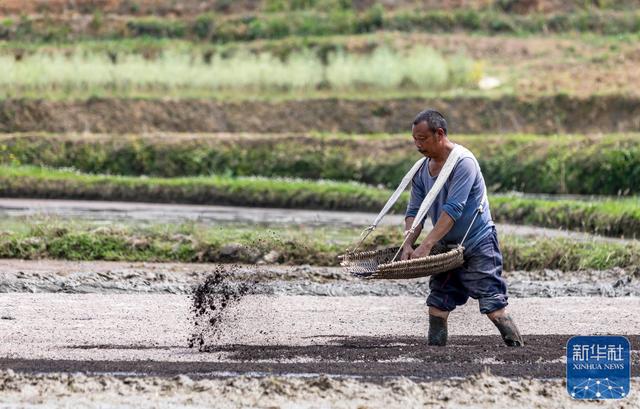 4月14日,村民在贵州省黔西市文峰街道双星社区农田播种育秧。新华社发(范晖摄)