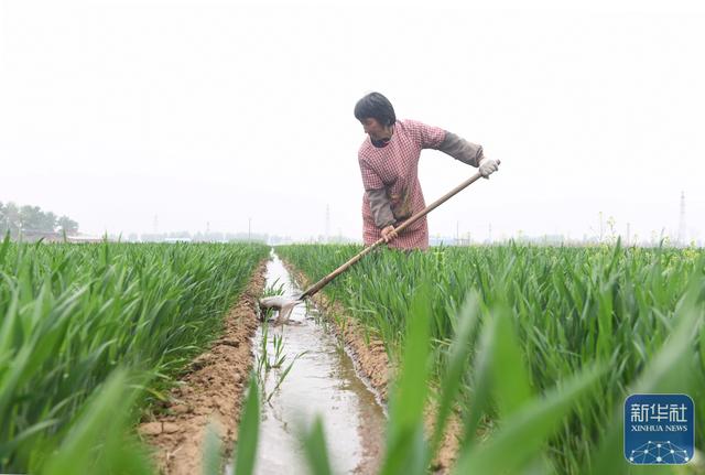 4月14日,河北省新乐市东名村农民在麦田劳作。新华社发(贾敏杰摄)