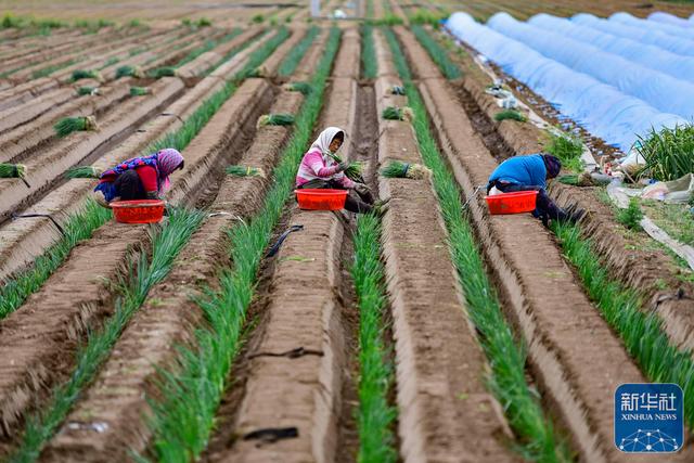 4月14日,在山东省青州市后坡村,农民在田间栽植葱苗。新华社发(王继林摄)