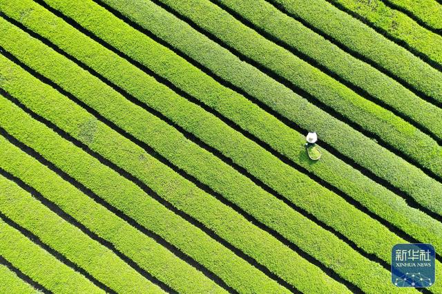 4月14日,茶农在湖北省宣恩县椒园镇石马村的茶园里采摘春茶(无人机照片)。新华社发(宋文摄)
