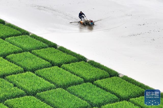 4月14日,在湖南省娄底市双峰县永丰街道泥湾村高标准农田,农民驾驶插秧机移栽早稻秧苗。新华社发(李建新摄)