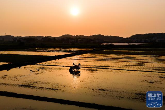 4月14日傍晚,在湖南省娄底市双峰县永丰街道泥湾村高标准农田,农民驾驶插秧机移栽早稻秧苗(无人机照片)。新华社发(李建新摄)