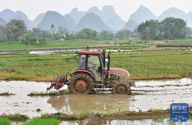 4月14日,在广西贺州市平桂区鹅塘镇鹅塘村,农机手驾驶拖拉机耕田。新华社发(廖祖平摄)