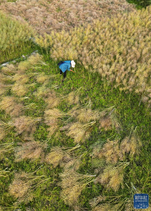 4月14日,贵州省从江县贯洞镇宰门村村民在田间收获油菜(无人机照片)。新华社发(卢忠南摄)
