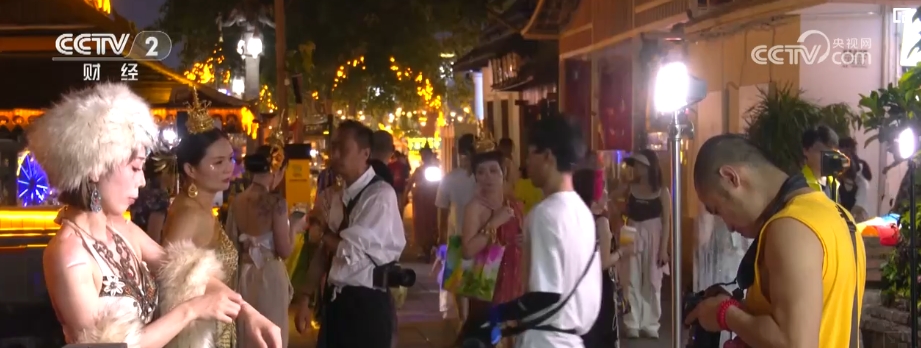 夜幕降临,在西双版纳景洪市的告庄景区里,很多游客身着民族服饰,化着精致的妆容,正在摄影师的指导下拍摄写真。