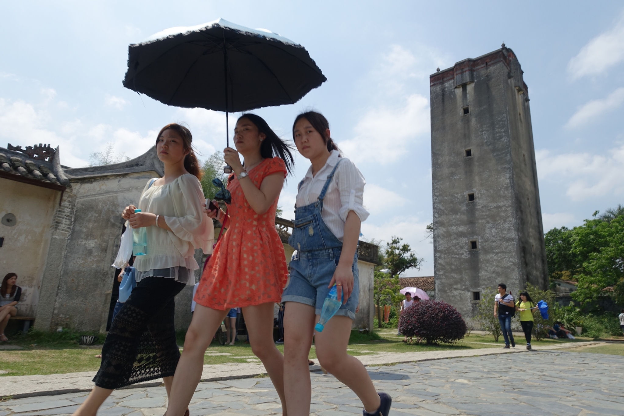 游客从深圳观澜镇版画村碉楼前走过。陈文 摄