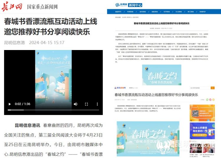 昆明信息港讯 记者王素晶 由昆明市融媒体中心·昆明信息港出品的“春城之约——书香漂流瓶”线上互动活动自4月15日上线以来,短短三天时间便吸引了超过800万人次的关注,共创“漂流瓶”超16000个。“春城之约”让书香弥漫网络。