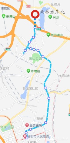 K57路调整后途经站点为“果林水库北(起始站)、果林水库南、云景路口(林溪路)、向阳路口(林溪路)、红枫路口(林溪路)、云湾路口(春漫大道)、经开区管委会(春漫大道)、旭照路口(春漫大道)、石龙路口(春漫大道)、大梨园路口(春漫大道)、碧潭街口(春融街)、祥和街口(春融街)、昆三中(春融街)、昆三中(春融东路)(去)、新区会堂(春融街)(回)、市政府(和谐路)(回)、市委(朝云街)(终到站)”,保留接驳地铁1号线市级行政中心清风地铁站的功能。