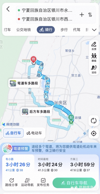除了提供实时的盲区预警,在日常出发前的路线规划阶段,高德骑行安全预警系统也会标识出后方来车超车和弯道会车高发的路段,让骑行用户在出行前就能了解潜在的风险高发点,预先做好应对准备。