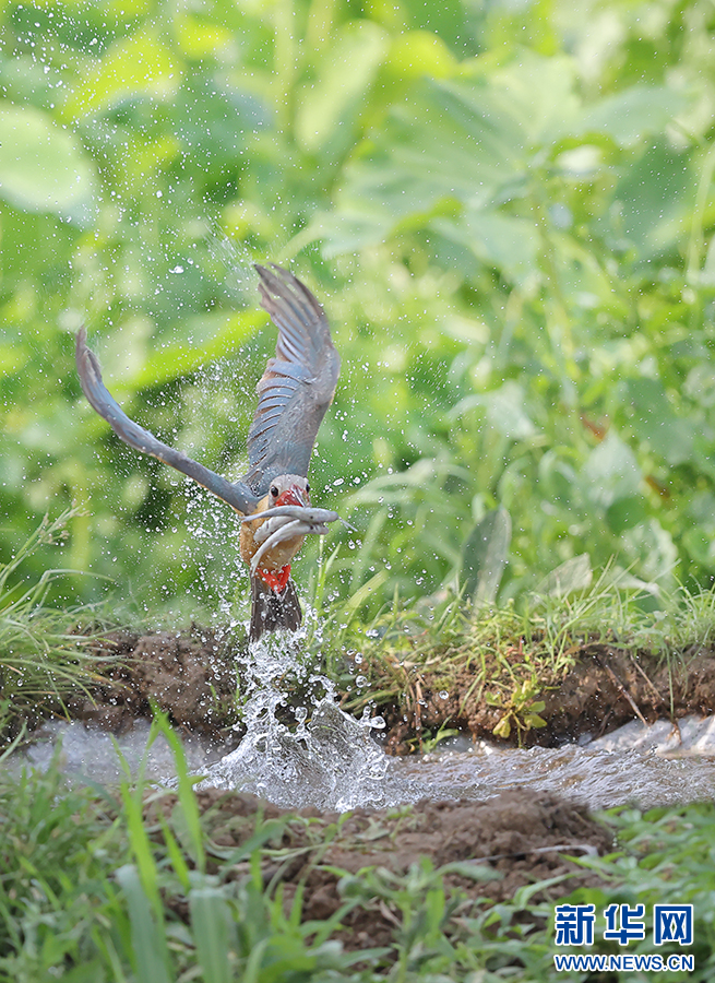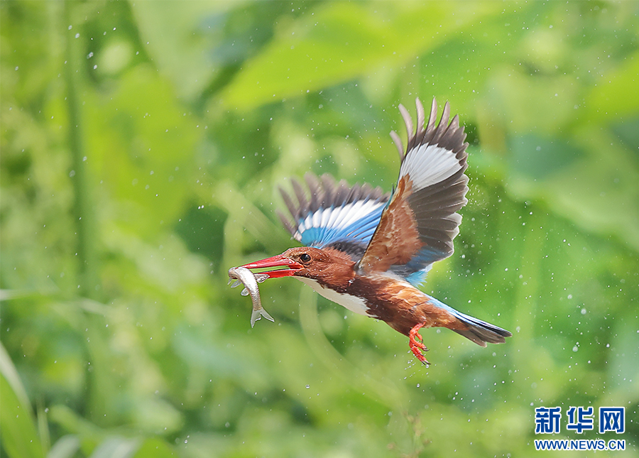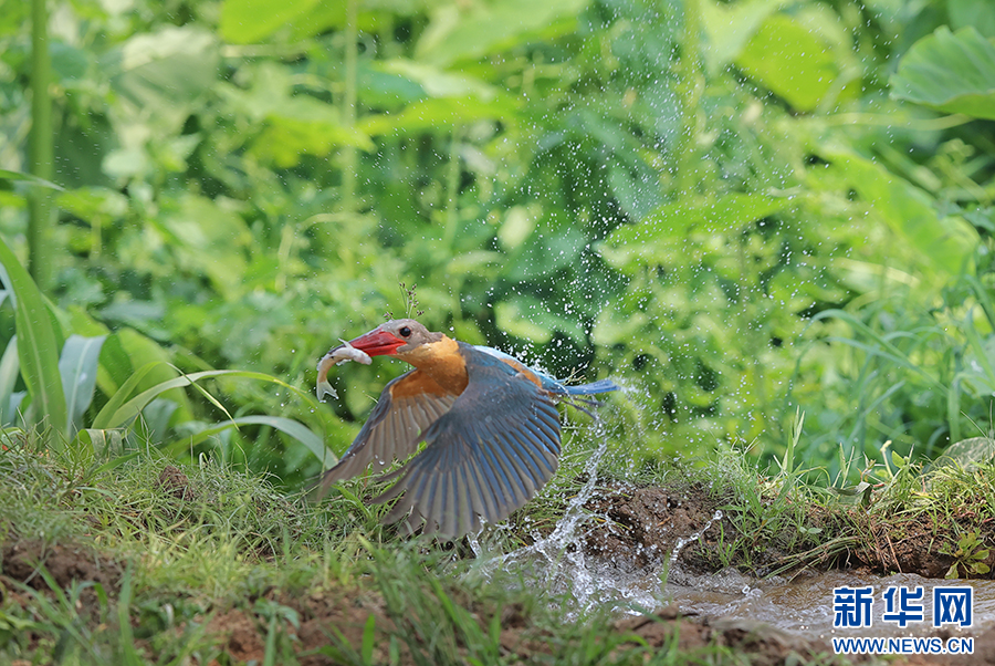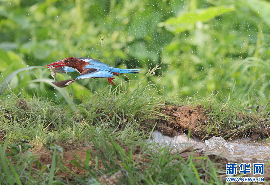 白胸翡翠捕鱼出水瞬间(4月15日摄)。新华网发(杨学飞摄)