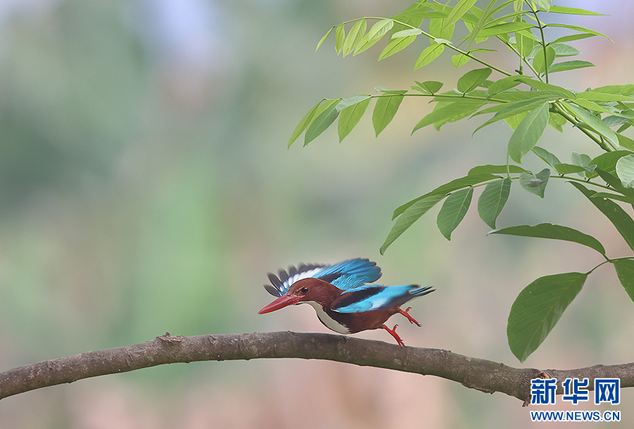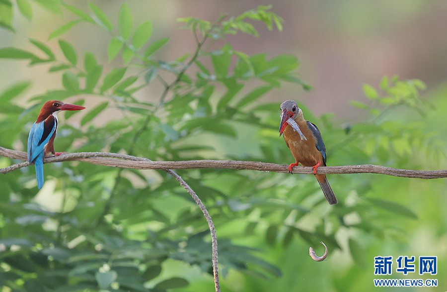 白胸翡翠叼着小鱼去喂雌鸟(4月15日摄)。新华网发(杨学飞摄)