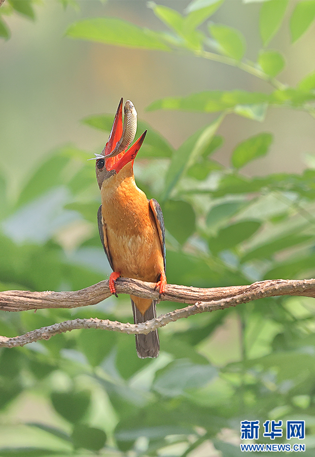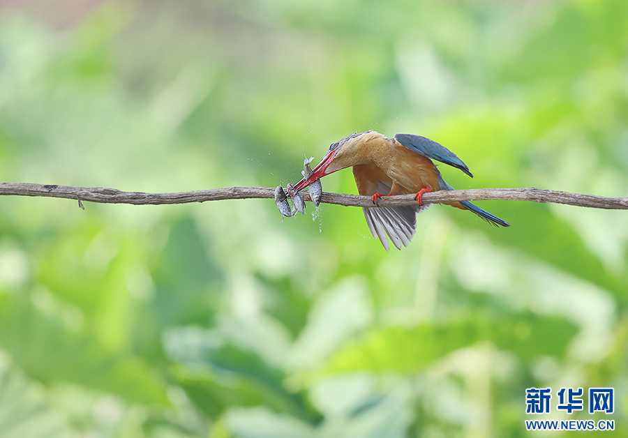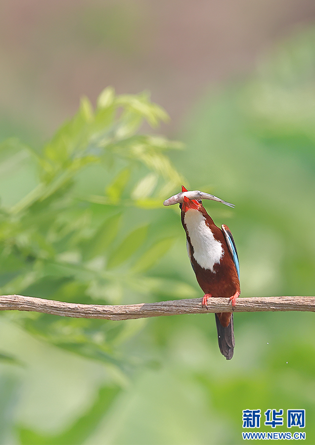 白胸翡翠玩耍小鱼后吞食(4月15日摄)。新华网发(杨学飞摄)