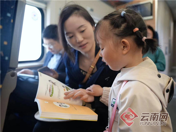在书香列车上,每节车厢两侧的车窗内张贴着第三届全民阅读大会标识和书香铁路标识,车厢入口处、两端镜框展牌均张贴全民阅读主题海报和从昆明市部分中小学、幼儿园征集评选出的“我眼中的中国铁路”优秀绘画作品。车厢里,每个座位的头枕片上都印刷着第三届全民阅读大会标识,列车视频播放全民阅读公益广告。为了给旅客提供良好的阅读条件,每节车厢一端都设置了书兜,餐车还设置读书角摆放优秀图书。列车上弥漫着浓浓的读书氛围。许多旅客手捧图书,不少家长还为随行的儿童借来童书,让孩子们徜徉在阅读的快乐中。