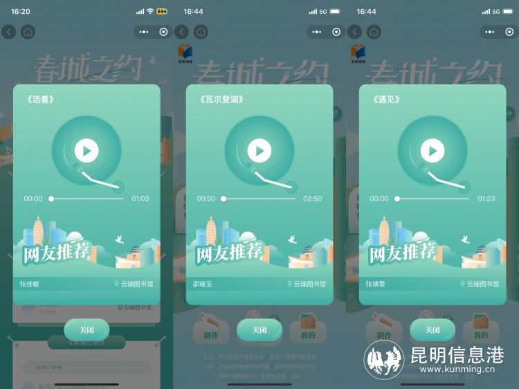 昆明信息港讯 记者李欣怡 线上阅读音频传递、“云端图书馆”好书推荐、公共文化空间线下推广……由昆明市融媒体中心·昆明信息港出品的“春城之约——书香漂流瓶”线上互动活动自上线以来,在全网引发热烈反响,吸引超过三千万人次关注。来自全国60余个城市的网友在线交流阅读体验,通过网络将阅读带来的快乐传递给更多人。