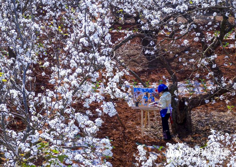 卓丽萍在梨花田间作画。韦嘉萍拍摄