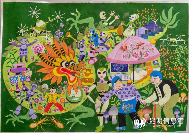 在许建初的指导下,卓丽萍创作了《智慧乡村》系列作品,以中国传统吉祥龙图案为载体融入智慧农业、乡村旅游中,数字乡村未来机器人服务大众,将养老模式,机器人带娃模式,演出模式等融入日常生活,从图中两位老人携手微笑的表情体现着新时代农民的幸福满足感花朵和龙采用传统刺绣手绘图案,旨在传承和创新非速传统文化,以绿色推进”一带一路”全球生态文明建设。