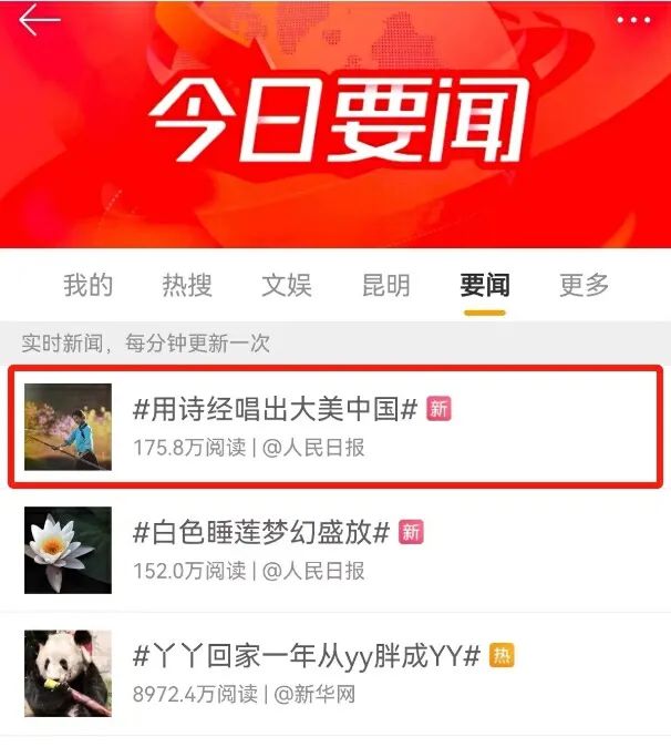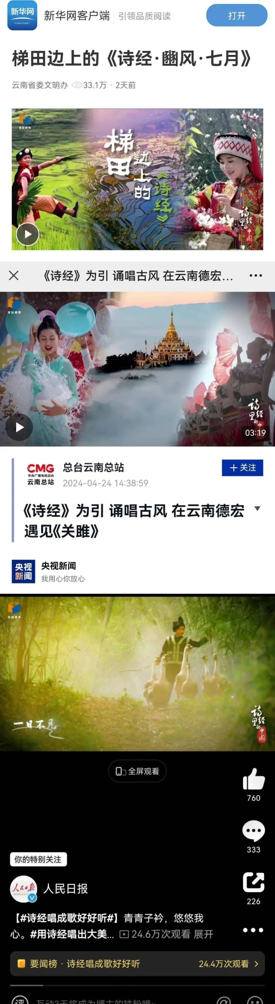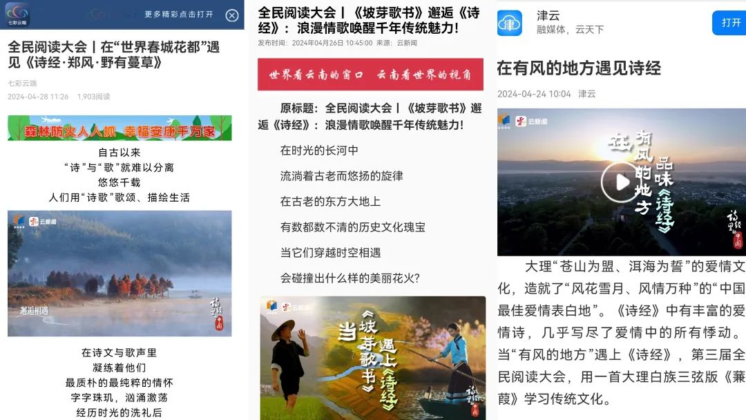 第三届全民阅读大会期间,由省委宣传部、省委网信办主办,省委文明办统筹、策划,云新闻客户端和昆明、玉溪、红河、文山、大理、德宏六个州(市)党委宣传部承办的“诗经里的中国”诵读演唱活动,将《诗经》经典名篇与“有一种叫云南的生活”IP相契合,与云南六座城市的文脉相融合,展示中华文化经典之美、生态云南之美、民族团结之美、城市发展之美。