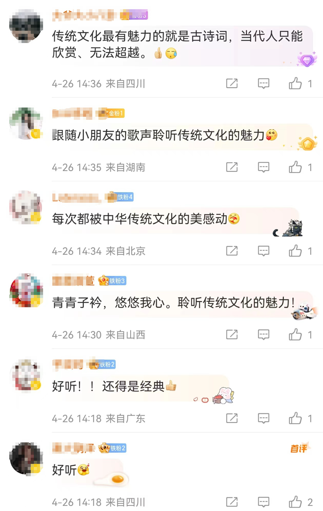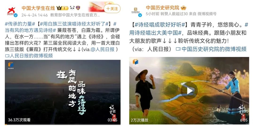截至4月29日9时,人民日报、央视新闻、新华网、光明网、中国网等164家主流媒体共对“诗经里的中国”诵读演唱活动系列稿件、视频转载720余次。活动主话题#诗经里的中国#及延伸话题阅读量超过6.1亿次,讨论量超过1.2万次,上榜微博热搜3次。