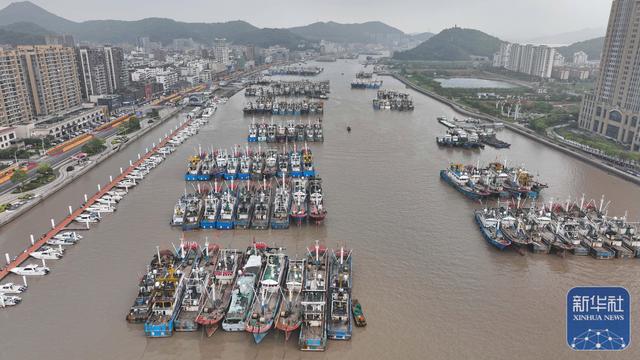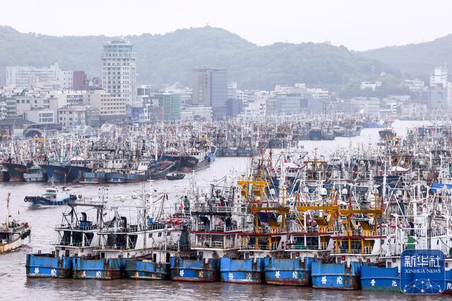 4月29日,浙江省舟山市普陀区沈家门渔港内锚泊的渔船整齐排列,有渔船陆续进港。新华社发(姚峰 摄)
