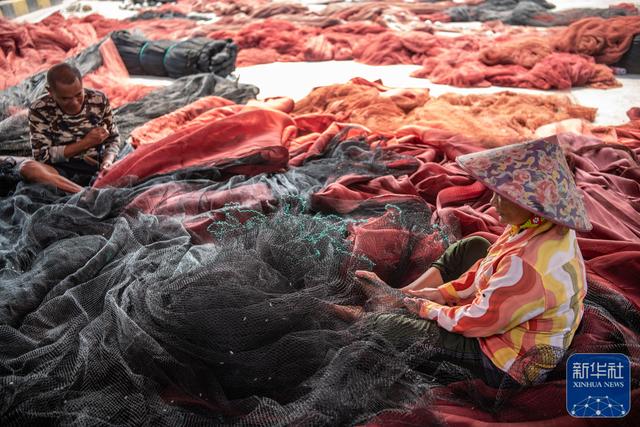 4月28日,渔民在海南省琼海市潭门港码头补网。新华社发(蒙钟德 摄)