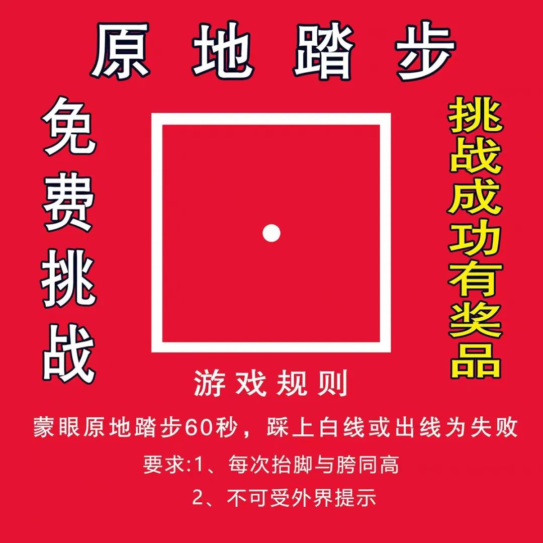 蒙眼踏步挑战:蒙眼原地踏步60秒,踩上白线或出线外为失败,每次抬脚与胯同高,不可受外界提示,如有违反,成绩不算。我们将在室外篮球场举办这一活动,每人免费参与一次,挑战成功者可领取我们为您精心准备的小礼物。