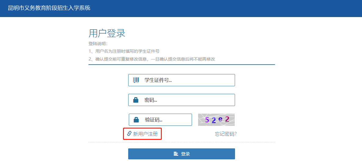 进入注册页面后,一是输入昆明市主城区小学学籍号或是从区教育部门获得的个别生临时学籍号(提示:输入的学籍号与学生证件号必须与昆明市义招网中的数据相匹配,方能通过验证顺利注册);