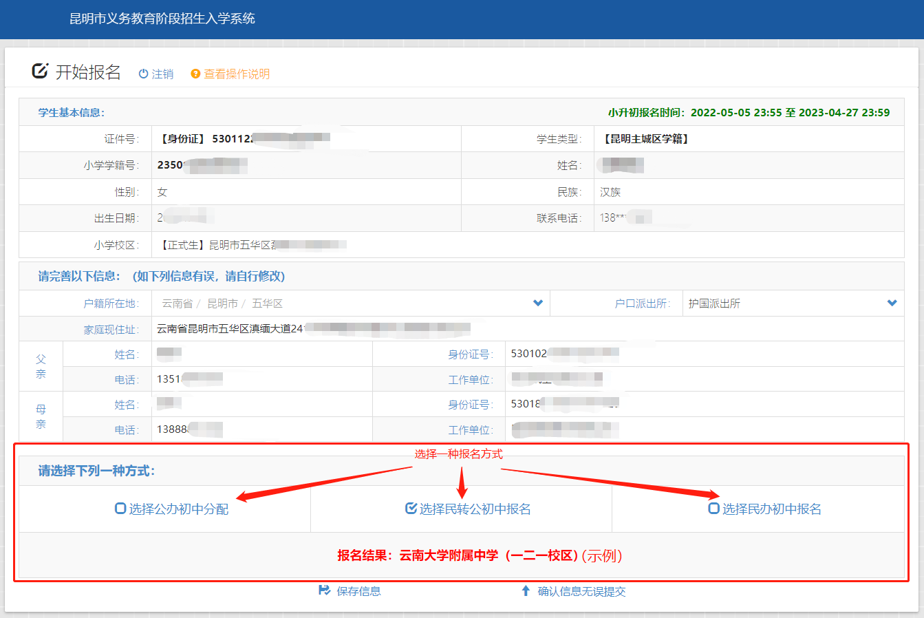 系统会依据前期毕业小学或区教育部门在昆明市义招网中建立的电子档案,自动填写学生基本信息,请家长根据所列信息修改完善即可。如下图所示: